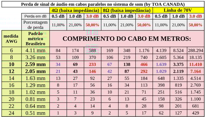 Tabela de bitola de cabo paralelo para uso em instalações de sonorização em alta impedância 100v (by TOA CORPORATION):